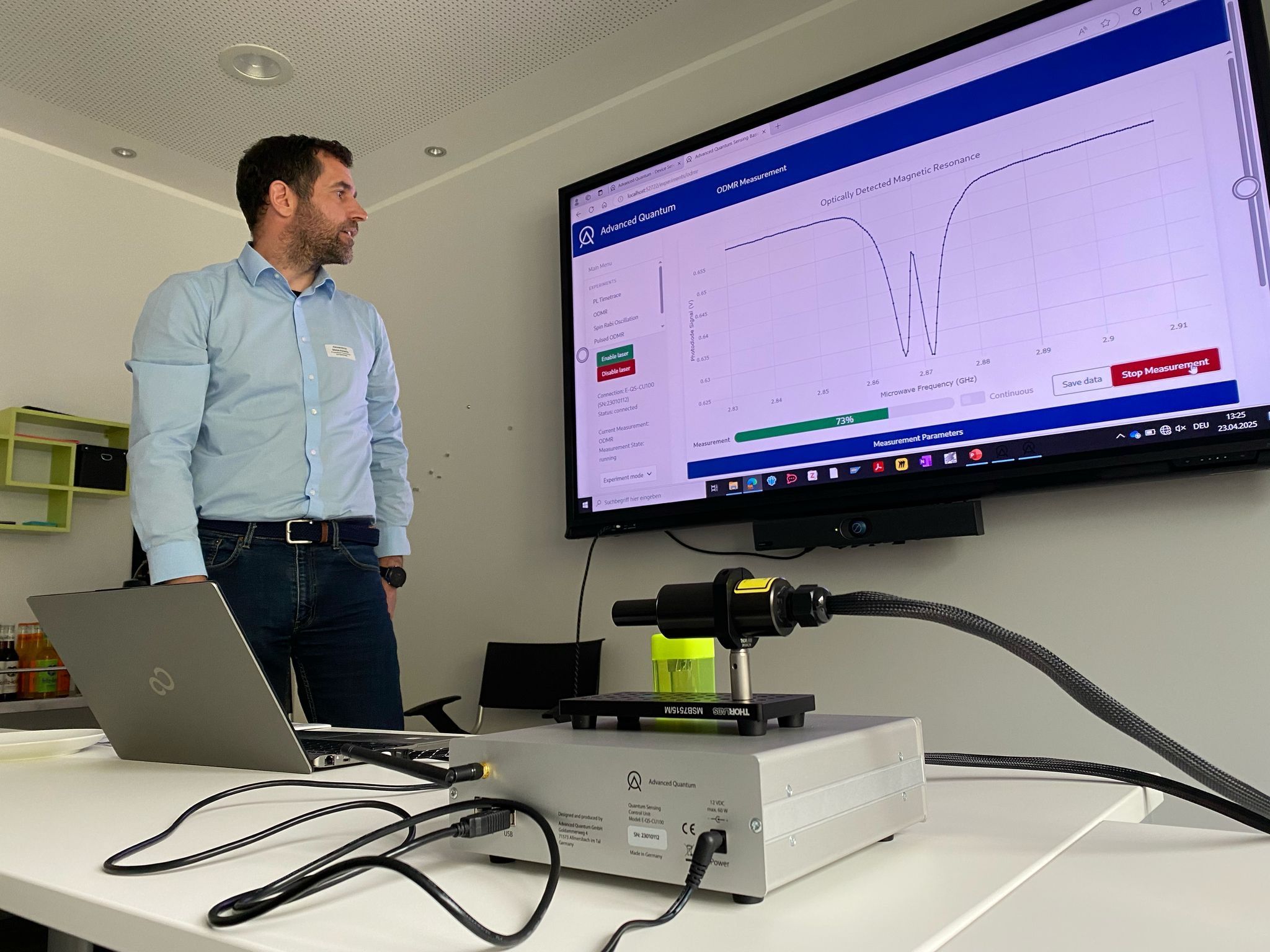 On 23 April 2025, the workshop “Quantum Sensor Engineering – Diamond-based Sensors” took place at TECH 2, SCIENCE AREA 30X in Hannover, as part of the European QTIndu initiative, organised by Physikalisch-Technische Bundesanstalt (PTB) in collaboration with HannoverImpuls. Led by Dr Alexandros Metavitsiadis, the workshop introduced the fundamentals and industrial relevance of quantum sensing and quantum magnetometry, combining theory with hands-on experiments using diamond NV centres and a custom education kit. The event concluded with lively discussions on real-world applications and cooperation opportunities in the quantum technology sector.